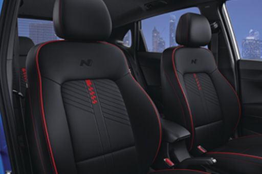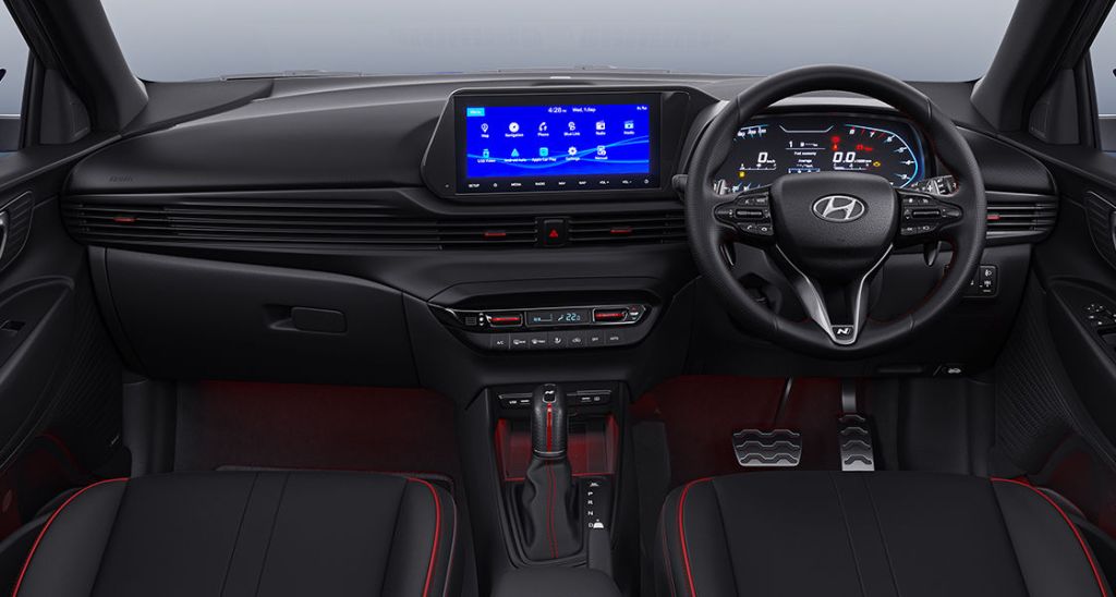 The interior of the i20 N Line is designed to be sporty and stylish. It features red stitching on the seats and steering wheel, metal pedals, and a leather-wrapped gearshift knob. The seats are sporty and supportive, providing a comfortable driving experience. The i20 N Line also has a larger 10.25-inch touchscreen infotainment system with Apple CarPlay and Android Auto compatibility, making it easy to stay connected on the go.