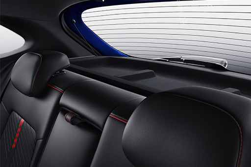 - Comfortable and stylish interior with red stitching on the seats and steering wheel, metal pedals, and a leather-wrapped gearshift knob