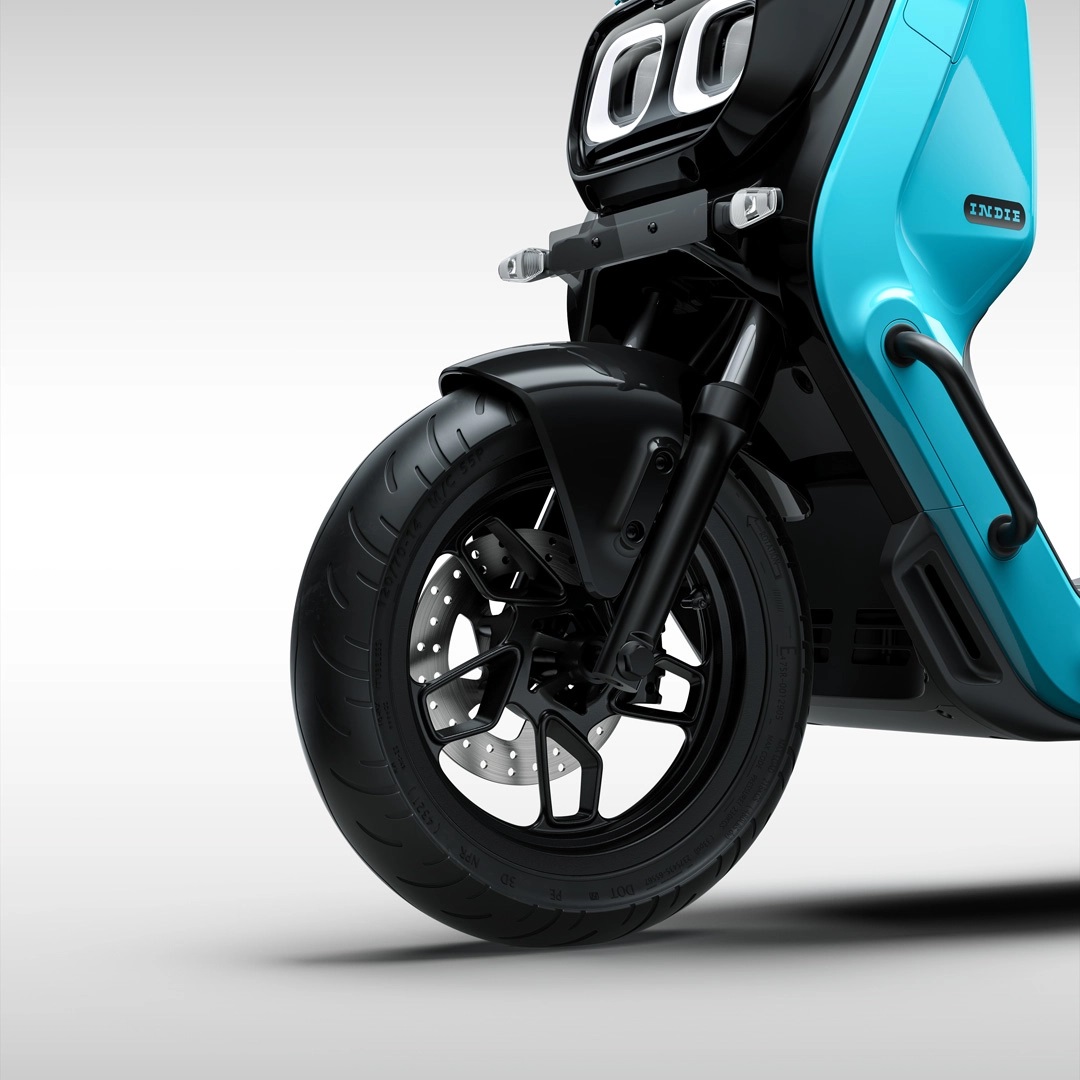 The River Indie Electric Scooter comes equipped with a combined braking system that includes hydraulic triple-piston disc brakes on the front and hydraulic single-piston disc brakes on the rear. The front disc size is 240 mm, and the rear disc size is 200 mm. The scooter also features a telescopic suspension with hydraulic dampers on the front and a coil spring with twin hydraulic dampers on the rear.