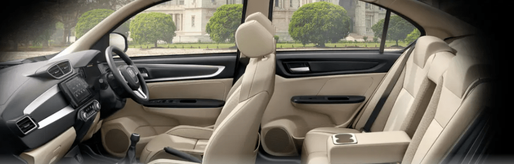 The interiors of the Honda Amaze Car are spacious and comfortable. The seats are designed to provide maximum support and comfort during long drives. The car’s cabin is loaded with advanced features like a touchscreen infotainment system, climate control, and a rearview camera. The car’s spacious interiors also provide ample legroom and headroom, making it perfect for long journeys.