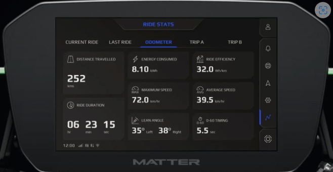 The Matter Aera Electric Bike is equipped with front and rear disc brakes with ABS for superior stopping power, and has forward and reverse park assist for added convenience. It also has a comfortable suspension system that provides a smooth ride even on bumpy roads.