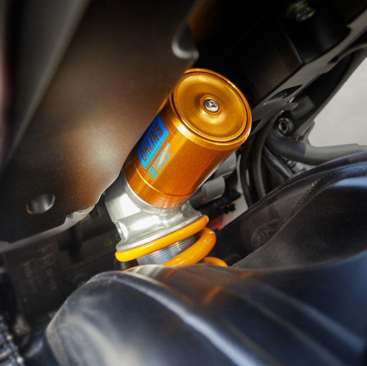 - Telescopic inverted fork with an inner diameter of 43mm and Öhlins NPX Smart-EC with preload