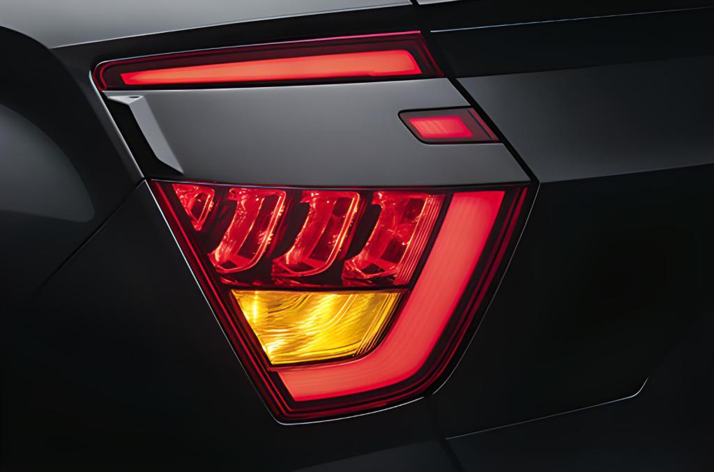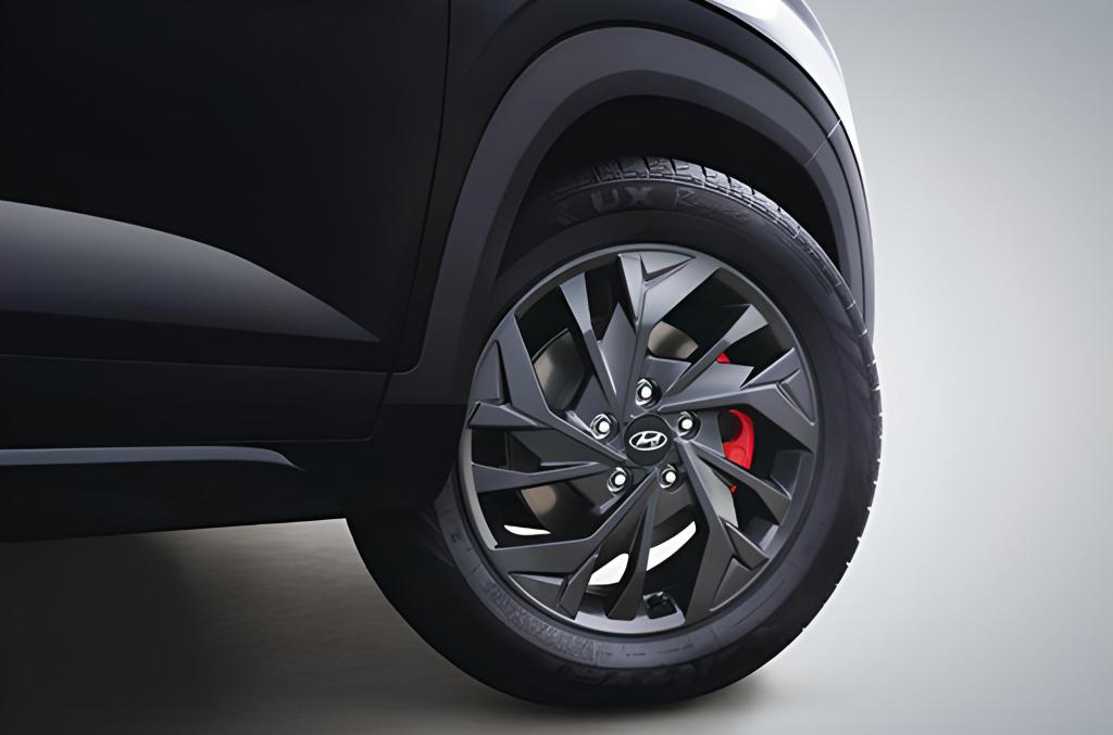 The Hyundai Creta Knight Edition features a bold exterior design with black gloss radiator grille with red inserts, red front brake calipers, black gloss front, and rear skid plates, trio beam LED headlamps with crescent glow LED DRLs, black gloss C-pillar garnish, and LED tail lamps. The next-gen imposing triple slat hexagonal chrome grille imparts a regal and dynamic look. The front fog lamps are smartly positioned in the newly designed and sculpted bumper. The signature cascading grille imparts a more premium and bold look. The lightning arch C-pillar with unique C-pillar garnish looks distinctive and brings out the dynamic character of the car.
