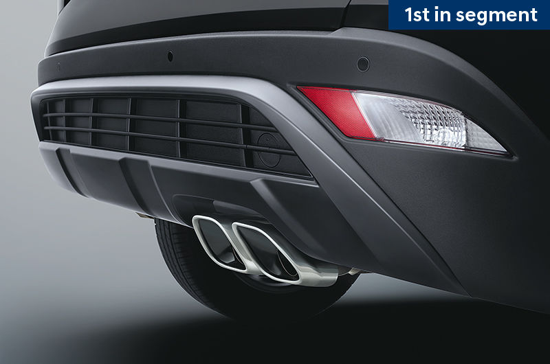 The Hyundai Creta Knight Edition’s exterior is imposing, with smooth creased hood lines and a voluminous bumper making a dramatic first impression. The trio beam LED headlamps with crescent glow LED DRLs impart a futuristic look and offer enhanced visibility. The twin tip exhaust adds sportiness and boosts hi-performance appeal. The long bonnet with muscular crease lines adds to the imposing stance of the SUV. The integrated front skid plate boosts sporty appeal.