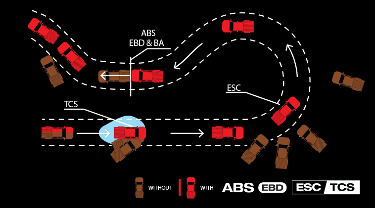 - ABS+EBD+EBA, ESC with TCS, HDC